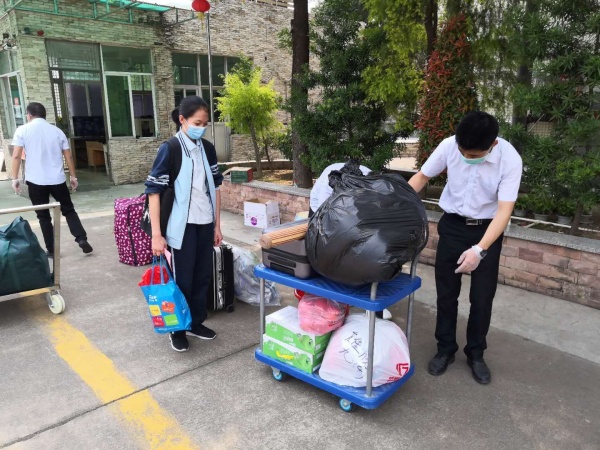 13時整,初三學(xué)生正式開始報到。出于安全考慮,在寫著“德恒學(xué)校歡迎高三、初三孩子回家”的紅色帳篷里,返校學(xué)生需要“過五關(guān)斬六將”,比如,站在一米以外向班主任遞交開學(xué)所需資料,由校醫(yī)監(jiān)測體溫,行李消毒等等,經(jīng)過層層的驗(yàn)核,方能進(jìn)入他們闊別已久的校園,充滿儀式感的返校流程讓疫情之后的復(fù)學(xué)變得更富有意義。除此之外,學(xué)生本次返校和以往最大的不同在于,由于疫情,家長們只能站在緩沖區(qū)外,目送孩子進(jìn)入校園,所以繁重的行李成了他們最頭痛的事情。事實(shí)證明,家長和孩子們的擔(dān)憂完全是多余的,由九年級的科任老師和學(xué)校行政臨時組成的“德恒搬運(yùn)隊(duì)”,“文能教書育人,武能負(fù)重前行”,整個過程不遺余力地幫助孩子們運(yùn)送行李,成為當(dāng)日復(fù)學(xué)路上一道亮麗的風(fēng)景線,這樣的暖心之舉得到了在場家長和學(xué)子們的一致稱贊。