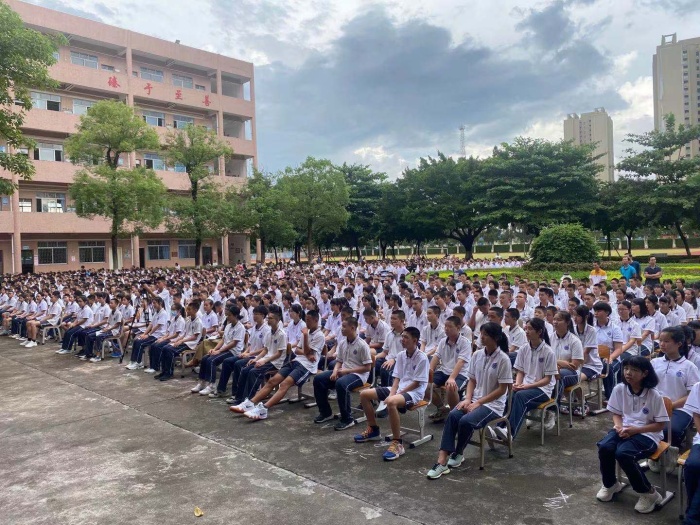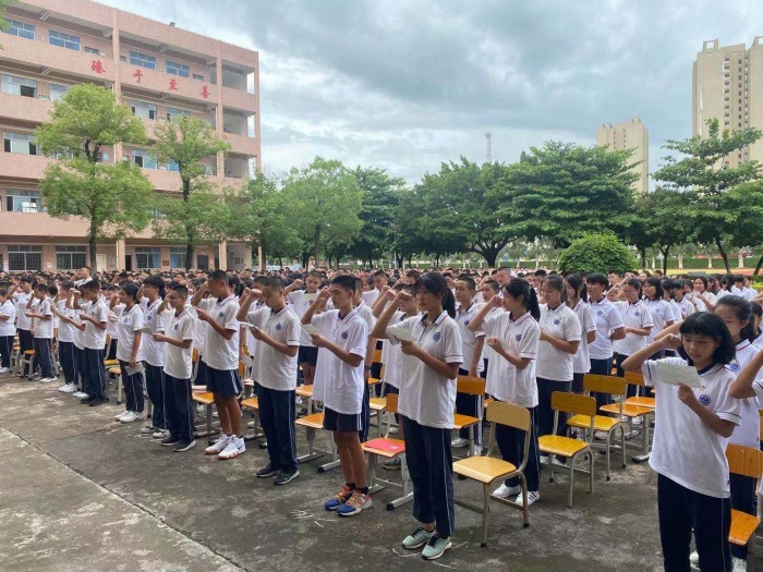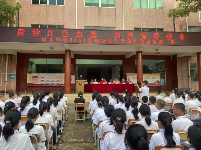秋風送爽、丹桂飄香。9月1日下午,民眾中學舉行2021學年秋季開學典禮暨思政第一課,全體師生在綜合樓大堂前參加典禮。