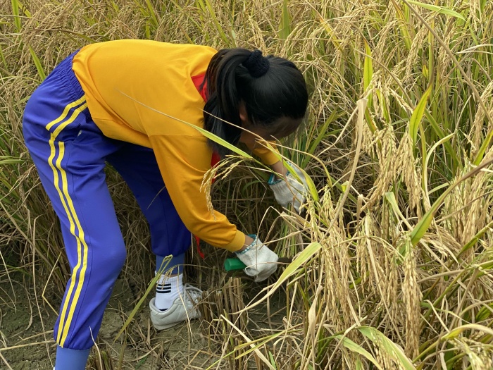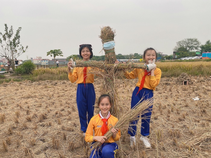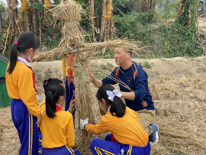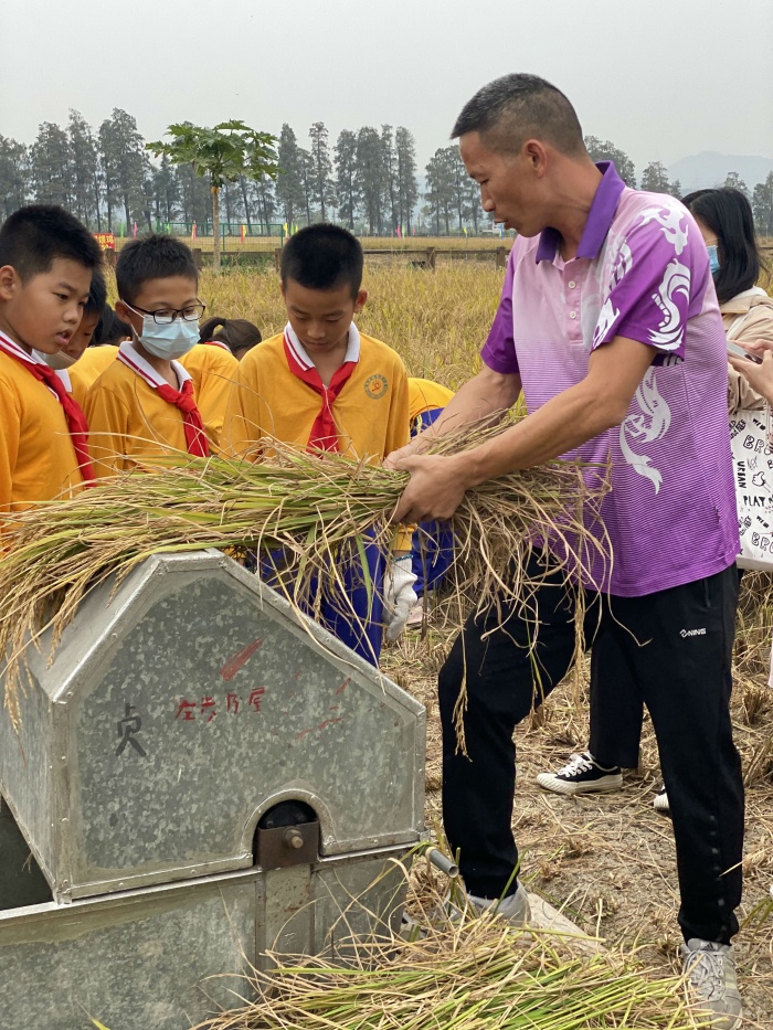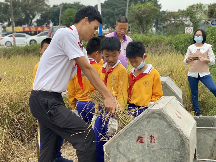 課程結束后,師生懷著期待興奮的心情共同前往“左步稻田”。隊員們五人一組,手握鐮刀,在現(xiàn)場農(nóng)民叔叔和老師的指導下走進稻田,卷起小褲腳彎下腰,左手抓稻,右手握鐮刀,刀口向下斜,手起刀落,當快樂小農(nóng)夫來一場豐收之旅。收割后,隊員們還在老師的指導下用打谷機進行稻谷脫粒。同時現(xiàn)場還進行了扎稻草人活動,隊員們沉浸在扎稻草人的歡樂中,不亦樂乎。