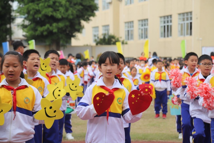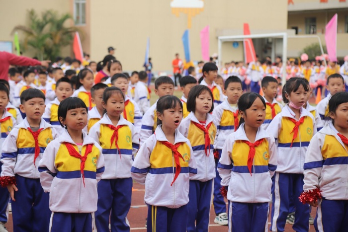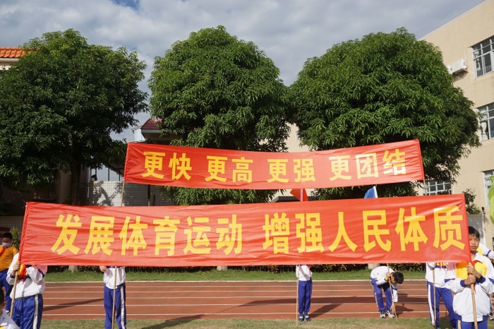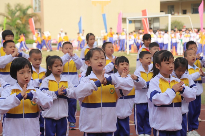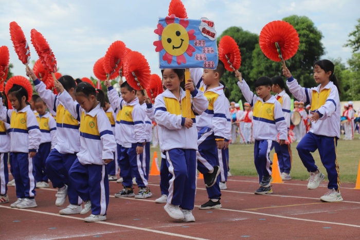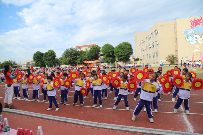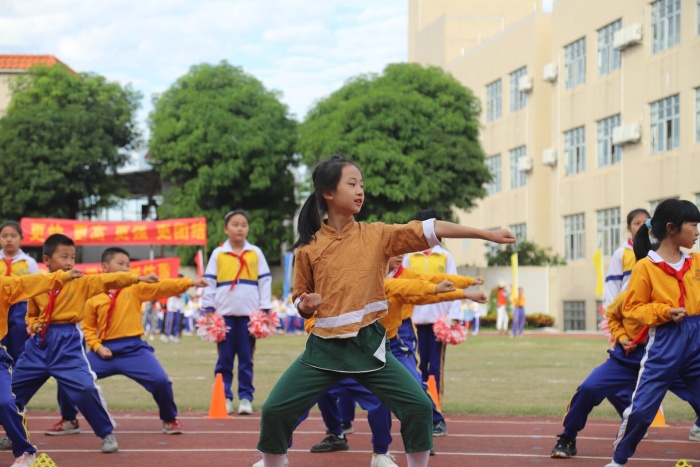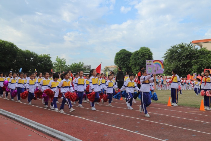 隨后,入場的是由各班學(xué)生組成的各個方陣,他們穿著統(tǒng)一的著裝,手舉著令人奮進向上的標語,踏著整齊劃一的步伐,喊著響亮的口號,昂首挺胸,精神抖擻,井然有序地入場。有些班級在行進過程中,還呈上了精心準備的節(jié)目,演員們出彩的表演,給師生們留下了深刻的印象,操場上響起了一陣喝彩聲。隨后,學(xué)校還展示了一、二年級《春曉》集體操,三、四、六年級《三字經(jīng)》集體操,以及五年級花樣啦啦操。表演結(jié)束后,全校師生舉行了莊嚴肅穆的升旗儀式,集體齊唱國歌。然后,由肖凱銓副校長致開幕詞。肖副校長希望同學(xué)們發(fā)揚陽光體育的精神,文明比賽,展現(xiàn)師生們的健康體魄,增強健康理念,養(yǎng)成愛運動的習(xí)慣,保持良好的身心健康狀態(tài)。最后,裁判員代表陳麒安老師和六(2)班的運動員代表發(fā)言宣誓,他們都有一個共同的愿景,希望同學(xué)們本著嚴肅、認真、公平、公正的態(tài)度,在運動會中頑強拼搏,不斷進取,賽出水平、賽出風(fēng)格。
