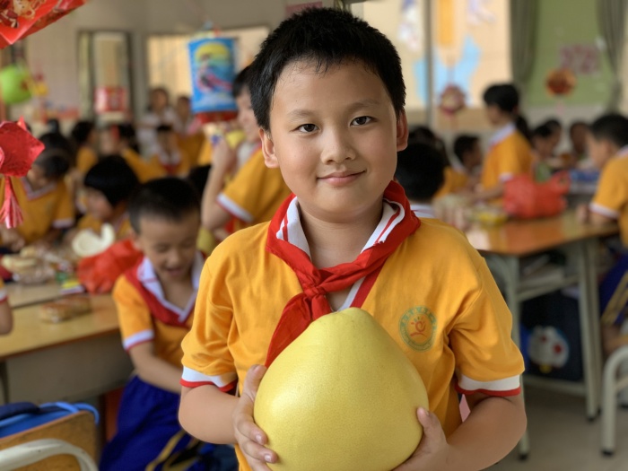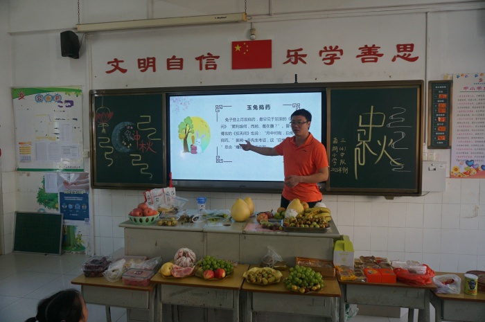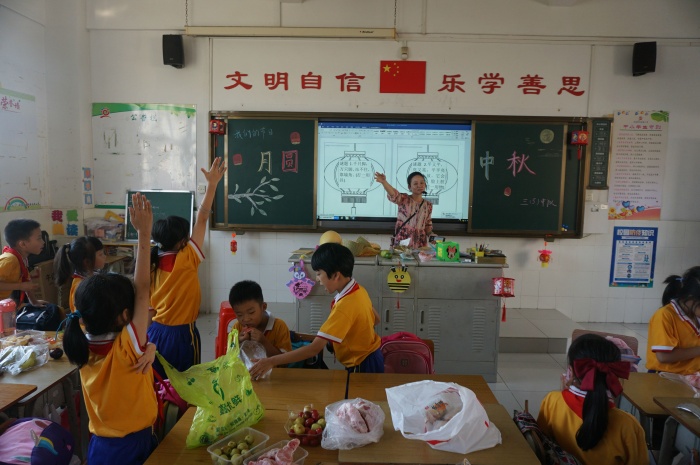 課室里,裝飾著孩子們親手制作的節(jié)日燈籠。講臺上,教師向孩子們介紹了中秋節(jié)的來源和有關的民間故事,讓他們七嘴八舌話中秋。接著帶領孩子們了解當?shù)刂星锕?jié)傳統(tǒng)習俗,通過品嘗菱角、板栗、花生、月餅等南朗本地應節(jié)食品,感受傳統(tǒng)節(jié)日氣氛。童稚的聲音吟誦著許許多多有關中秋節(jié)的詩歌,傾訴孩子們對傳統(tǒng)節(jié)日的好奇與期待。此外,學生們還在課堂上討論了當代背景下,如何文明過好有意義的中秋節(jié)。