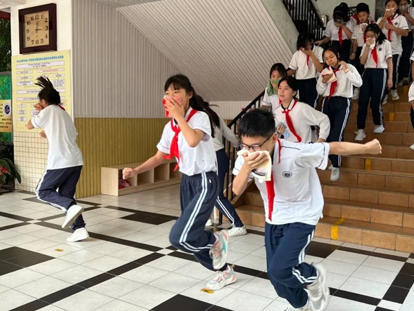 同學們聽從指揮迅速排成兩條縱隊,由班主任及科任老師沿疏散標志從就近安全出口撤離,大家用小毛巾捂住口鼻,彎著身體、快速有序地按照既定的逃生路線,撤離到學校運動場,從警報聲響起到最后一名學生撤離到廣場,共用時3分鐘。學生安全撤離到運動場后,各班迅速清點人數,確保每一名學生都已安全撤離,并及時將清點結果匯報給指揮員。