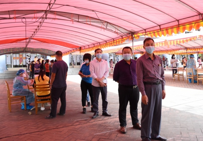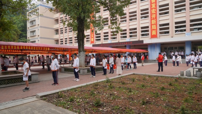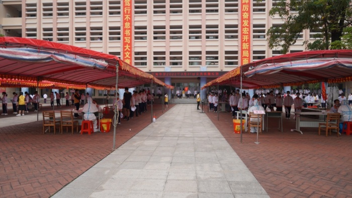 全校學生和教職工按照要求,準時到達學校初三樓前廣場進行核酸檢測。學校黨員領導起到先鋒模范作用,帶頭維護現場秩序,確保全員核酸檢測快速、平穩、有序進行。檢測現場,學校行政和教師按分工安排各就各位,維持現場秩序及進行“葵花碼”信息采錄。學生們也在教師的引導下,自覺規范佩戴口罩,10人一組,前后一米線間隔,分批進場接受咽拭子采集,整個檢測現場高效有序,僅用兩個小時就完成了全校師生員工的核酸檢測采樣工作。