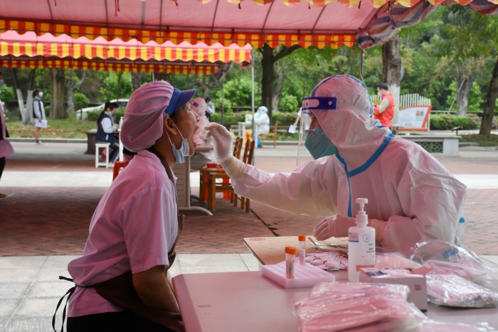 “全副武裝”的醫護人員一絲不茍,洗手消毒、拆棉簽,耐心地引導廣大師生完成咽喉拭子采樣,過程科學、規范。此次受檢人員不僅包括部分學生和全體老師,還有學校的宿管、保安、保潔及食堂人員等重點人群,每位受檢人員用自己的實際行動為校園防疫貢獻出自己的一份力量。