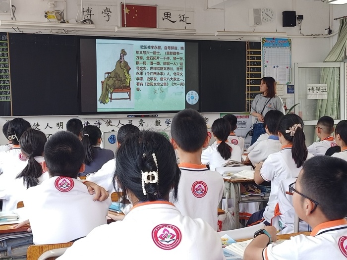 本次教研活動第一環節是跟崗老師上課,首先是跟崗教師張海波執教的初一語文《駱駝祥子》。張老師立足教材,以祥子的悲劇探因為主題,通過給每個章節取小標題的形式帶著學生再次重溫故事情節。在此環節中,張老師特別設置了有關祥子“三起三落”的情節,讓同學們梳理概括。同學們在熟悉情節之后,張老師聚焦祥子的“三落”,引導學生對關鍵語句、段落進行批注,在此基礎上,帶領學生細細琢磨祥子的心理變化,分析祥子悲劇的社會原因和個人原因。緊接著是跟崗教師余德芬,她執教的是初一語文《賣油翁》。余老師首先范讀課文,糾正字音,然后帶著全班學生齊讀課文,讀出節奏。接下來,余老師結合學案疏通本文文意,重點關注課文中的實詞和虛詞教學,并帶領學生著眼于課文中的兩個人物形象,借助學案分析人物形象的刻畫和特點。最后,運用分析人物形象的方法,課堂上進行練筆。