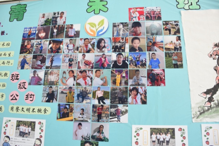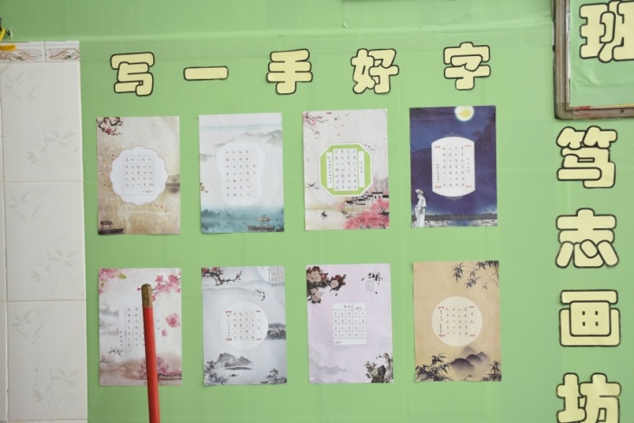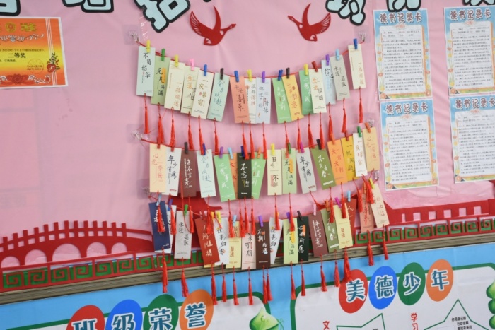 3.各班班主任還非常注重教室文化建設,充分利用教室資源,力求每一面墻都會“說話”,讓每個角落都富有教育意義。每個班級發揮班主任及學生的智慧,精心設計、巧妙布置,力求教室和諧、高雅,具有濃厚的綠色、和諧,彰顯文明溫馨的文化氣息,有的教室的兩側墻壁上掛了不少名人名言,以時時規范孩子行為,處處讓孩子接受知識熏陶的同時,讓孩子們學會做事做人。教室的后面黑板有宣傳欄、班級公務欄等,主要用于張貼課程表、作息時間表、值日輪流表等。黑板報上的內容根據不同注意和一些重要節日實時更新。不同的板塊都在記錄著孩子們成長的點滴,如美術、手抄版、書法等作品。有的板塊張貼著老師與孩子們的合照,下面書寫著班級的名稱、口號和座右銘,那是師生一起追求夢想的見證。也有班級創建了光榮榜,為了讓孩子們有一種健康的競爭意識,見賢思齊,并激發孩子們的學習熱情。