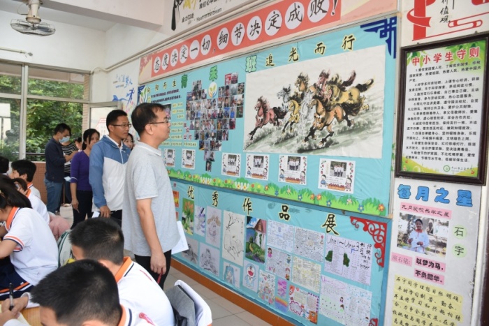 走進每一間教室,評委老師都會被富有個性的布置所吸引。作品欄里也是碩果累累,有排布規整的手抄報作品,有行云流水的書法作品,還有五彩斑斕的繪畫作品,以及各班公示的小組特色組名、口號、組員介紹等等。