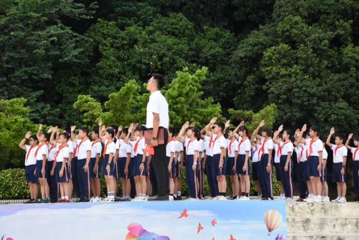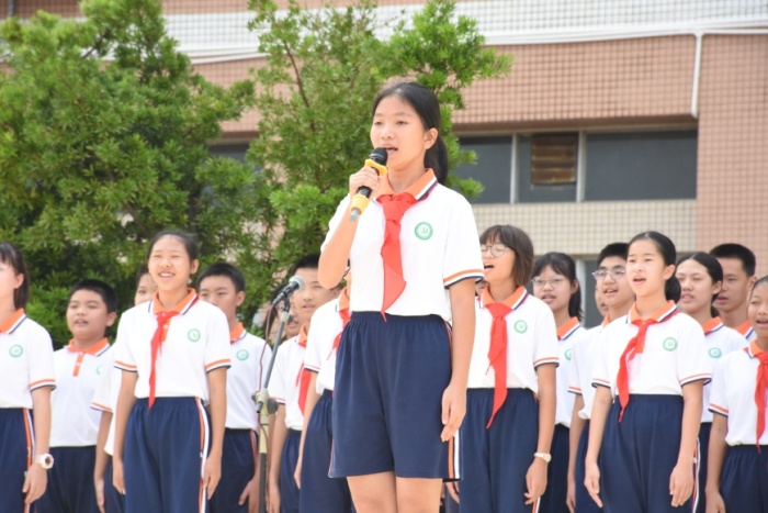 “五星紅旗迎風飄揚,勝利歌聲多么響亮,歌唱我們親愛的祖國,從今走向繁榮富強……”全場響起師生的國歌大合唱,三角中學師生們懷著崇敬的心情,熾熱的目光追著鮮紅的旗幟向上。隊員們佩戴紅領巾,敬著標準的隊禮,高唱著國歌,全體師生心潮澎湃,激動萬分,共同見證這莊嚴而美好的時刻!
