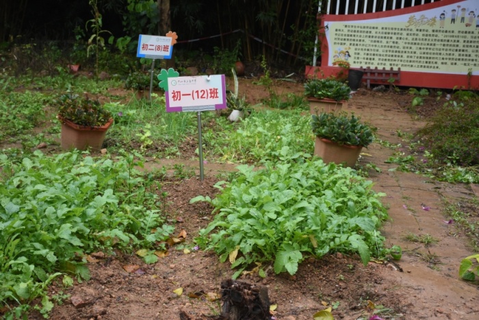 開學初,各班同學集思廣益,出謀劃策,對自己班級的勞動基地進行了科學規劃,制定了種植計劃,提前搜索要種植植物的資料,了解植物的生長過程和特點,為種植做好充足的準備。隨后,在班主任老師的悉心指導下,同學們對勞動基地進行除草、播種、澆灌,雖然基地面積有限,但是里面種植的蔬菜品種可不少,蘿卜、生菜、油麥菜、小蔥等。當學生親手播下種子時,便開始期盼;當學生看到第一顆新芽破土而出,便收獲勞動的喜悅;種子萌發、成長的過程是漫長的,在這個過程,我們的小農夫們也沒有閑著,澆水、除草、為自家農場立上牌子,圍上柵欄,為需要生長的枝蔓搭上架子,讓基地有了班級特色。同學們在勞作的過程學會了作物生長的規律,懂得了小心呵護和精心護理。期盼與收獲勞動成果的喜悅染滿了孩子們的臉龐,勞動基地中經常回蕩著老師們和同學們的歡聲笑語。