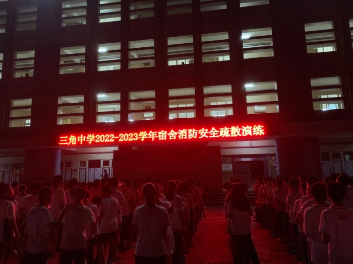 為積極響應第27個全國中小學安全教育日主題教育活動的號召,落實校園宿舍消防安全教育,提高學校師生的安全防范意識,增強自我保護能力,在危險時刻學會有序地進行疏散,確保全校師生的生命及財產安全,掌握對火災等突發事件的應變、逃生技能。9月28日晚,三角中學舉行宿舍消防安全疏散演練。