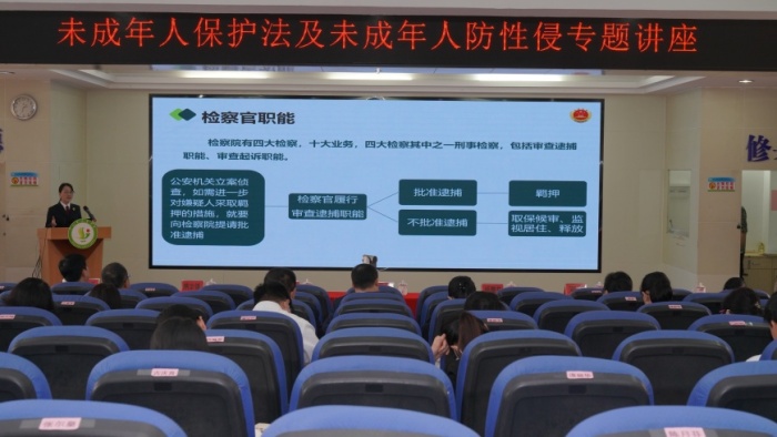 會議的第一項議程,由中山市第二市區人民檢察院鄧艷檢察官以“檢校共建防護網,護航青春不停步”為題進行未成年人保護法及未成年人防性侵專題講座。講座上,鄧檢察官從性侵害離我們的校園遠嗎?性侵害的法律適用、性侵害的預防和應對三個方面引入,并通過明確的數據,清晰的圖表和具體的案例重點講解了校園安全隱患、強奸罪、強制猥褻、侮辱罪、猥褻兒童罪和表現形式、如何預防、發現、應對未成年人性侵害案件等方面,她指出從預防的角度看,主要有兩個方面,加強校園安全管理和落實防性侵法治教育。在應對措施方面,鄧檢察官以“一號檢察建議”為切入點,圍繞2020年5月7日最高檢等九部門聯合印發的《關于建立侵害未成年人案件強制報告制度的意見(試行)》,結合《中華人民共和國刑法》等法律,通過觀看視頻、學習典型案例等方式,生動形象地宣講了強制報告制度的出臺背景、報告主體、應報情形、如何報告及追責機制等內容,并對教育工作中如何貫徹落實強制報告制度進行重點解讀,幫助教職工更好的理解強制報告制度的重要意義和執行必要,讓學校教師明確自身職責,明確新時代教師職業規范和師德底線。鄧檢察官細致的講解讓在場的老師們對《未成年人保護法》和預防未成年人性侵有了更加深入的了解。