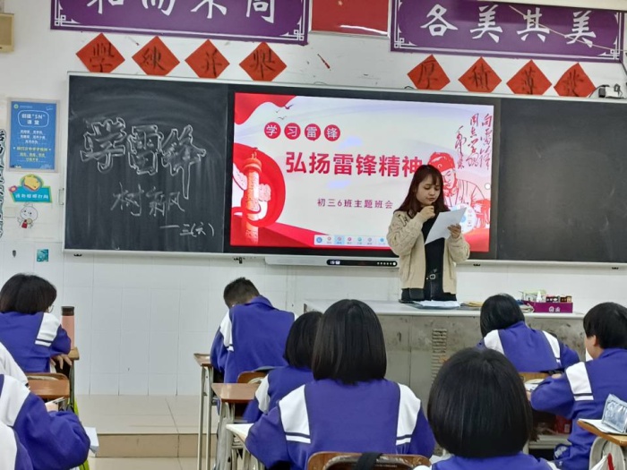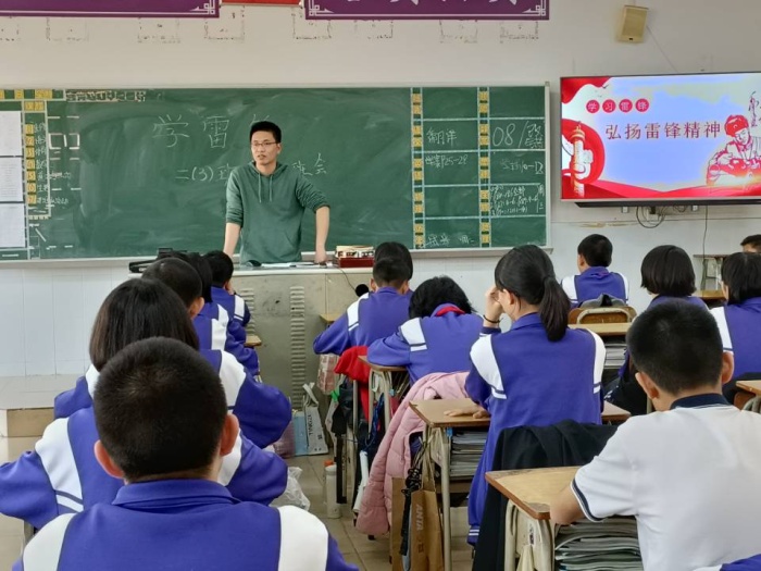 本次班會由各班班主任和班干部主持,現在的學生對于雷鋒的印象已經逐漸模糊,各班從雷鋒的成長歷程、生平事跡入題。老師們通過展示雷鋒部分日記,講述雷鋒助人為樂的事跡,闡述什么是雷鋒精神、雷鋒精神的時代內涵和雷鋒精神具體內容,總結身邊學習雷鋒做好事的例子,向學生們展示了一個學習的榜樣。學習了有關的知識后,班主任還結合班級特點進行教育。最后由班主任作了總結——雷鋒是我們學習的楷模,雷鋒其實哪兒也沒去,就在我們的身邊,只要我們少一點私心,不斤斤計較,說文明話、做文明事,文明知禮,“急人所想”班級一定更美好。