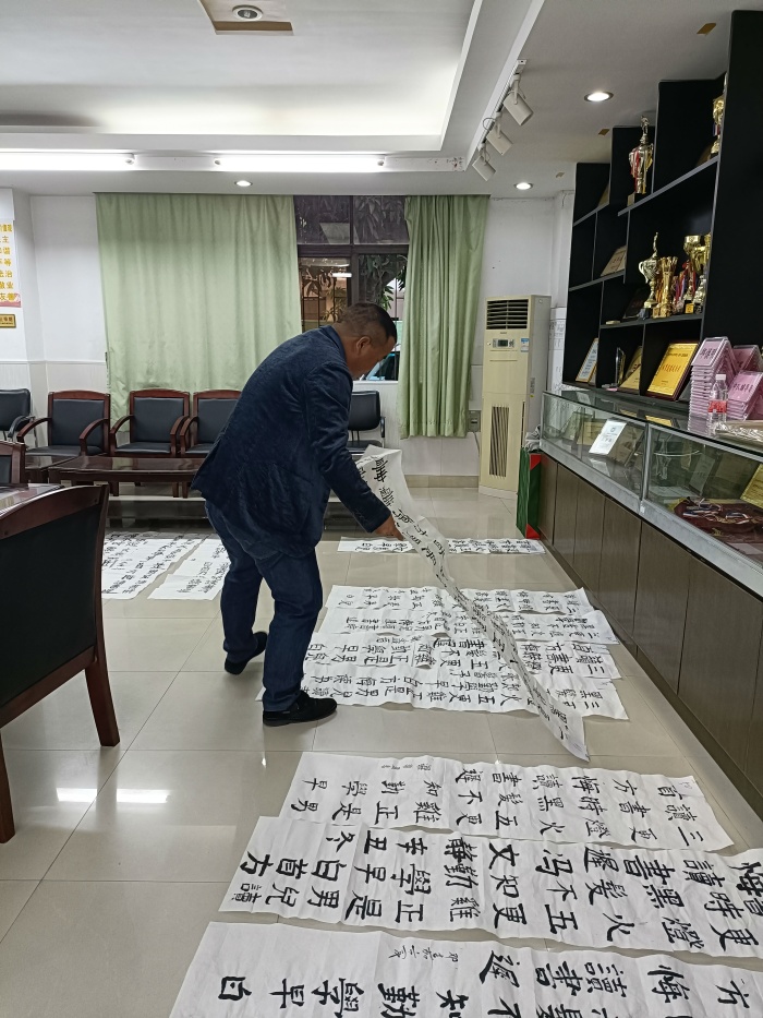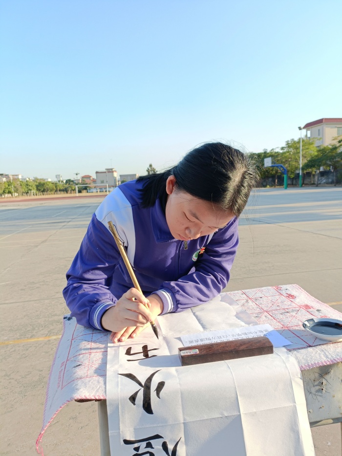 下午四點,毛筆書法現(xiàn)場大賽在學校操場順利展開,參加毛筆書法大賽的學生共有四十多人,學校為參賽的選手提供了比賽用紙、用墨、碟子等用具,參賽者必須在40分鐘內(nèi)完成作品,不完整的作品不能參評。本次活動策劃李常華、溫奕靈兩位老師首先向選手們發(fā)放了毛筆書法大賽的內(nèi)容,備選的共有6首古詩,分別用簡體和繁體印刷。主持人盧富生副主任介紹了活動主題、比賽規(guī)則后,比賽正式開始。選手們仔細思考,選材、折紙,全神貫注于作品的書寫中,一絲不茍,點橫撇捺,工整美觀,盡力表現(xiàn)出自己的最高水平,一張張紙上呈現(xiàn)出參賽學生的深厚書寫功底。同學們個個聚精會神,沉著冷靜,楷書、行書、篆書等筆畫有力,一個個清秀、工整的漢字充分展示了學生們良好的素質(zhì)和對傳統(tǒng)文化的熱愛。