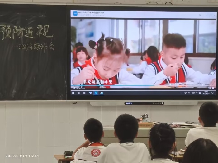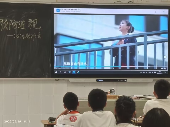 在班會上,同學們了解了什么是近視、近視的危害和保護眼睛的有關方法,例如:養成良好的用眼習慣、注意用眼時間、注意日常坐姿、課間走出課室眺望遠方、定期檢查視力等,還一起觀看了視頻“我有一個夢想——擁有一雙明亮的眼睛”。同學們反響熱烈,紛紛表示以后會注意保護好自己的眼睛。