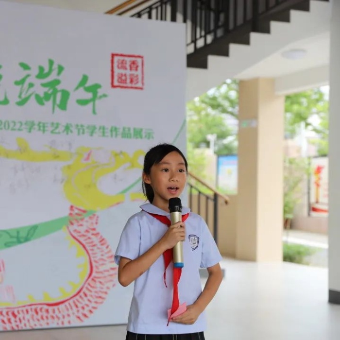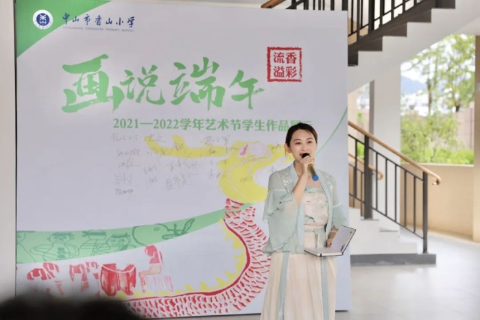 在孩子們的期待聲中,香山小學鄭鳳姚校長宣布:“2021-2022學年香山小學首屆流香溢彩藝術節‘畫說端午’主題學生作品展開幕”。