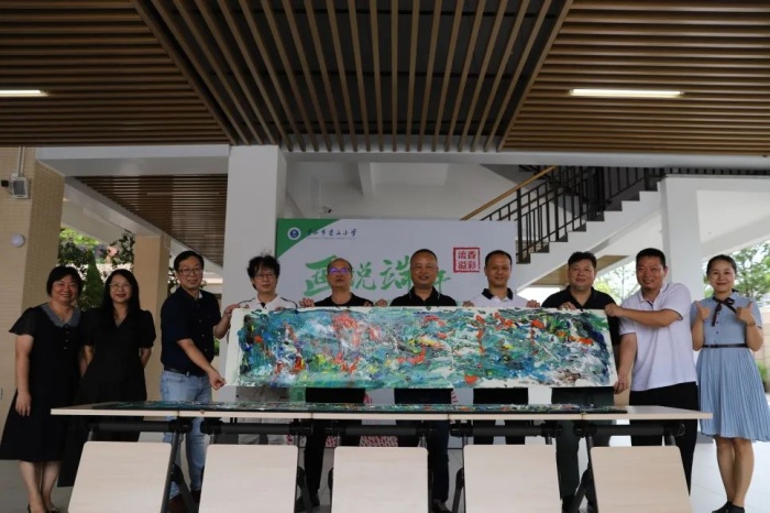 會后,與會專家來到香山小學美術室,就香山小學美術教育未來發展方向進行了深入交流和討論。而后大家現場揮毫,共同繪制八尺巨幅花鳥畫作品《香山春早》。