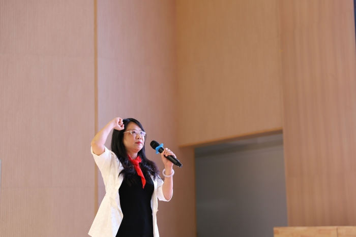 大隊輔導(dǎo)員楊秀娟老師緊接著帶領(lǐng)新隊員們高高舉起右拳,共同宣誓。
