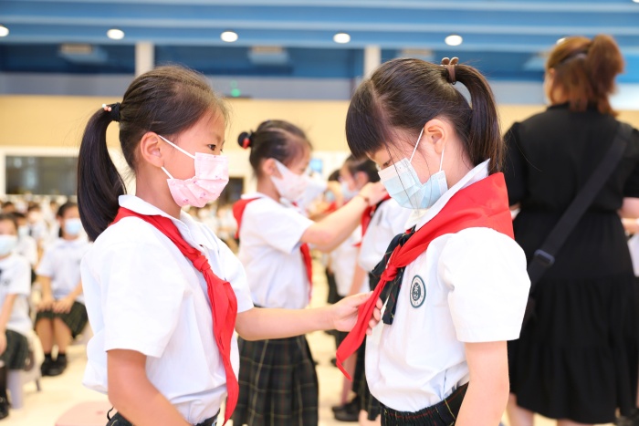 對于新隊員們來說,最期盼的時刻莫過于帶上鮮艷的紅領(lǐng)巾了。“播一粒種子,讓心愿發(fā)芽開花;用繽紛的果實,把陽光報答。”在輕快的《生長吧》歌曲聲中,二年級的哥哥姐姐們?yōu)樾玛爢T們佩戴紅領(lǐng)巾。