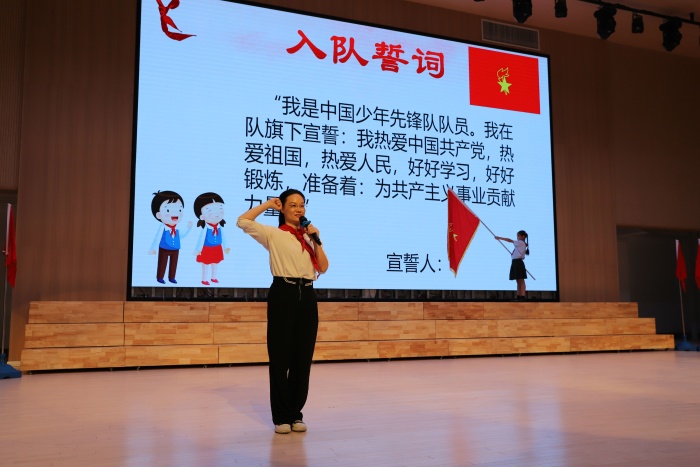 接著,學(xué)校少工委主任鄭校長領(lǐng)全體隊員呼號,一句洪亮的“時刻準(zhǔn)備著!”展現(xiàn)了新隊員們的活力與堅定。