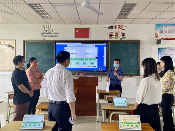 調研組一行到校后,來到溪角中學多技術融合智慧課堂課室觀摩了陳燕老師展示希沃白板、讀書郎智慧課堂平臺與學生平板的交互運用情況。陳老師結合自身使用智慧課堂的體驗,肯定了智慧課堂的應用價值:智慧課堂增強了課堂的互動性,即時反饋的功能,能讓教師快速關注到每個學生學習情況,激發了學生學習積極性,實現了分層教學。