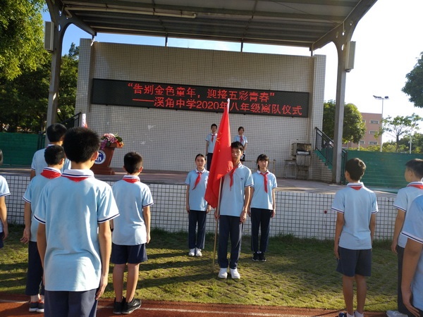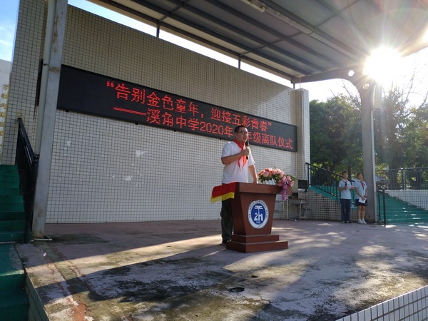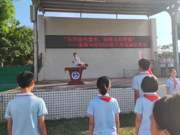 6月12日下午,溪角中學舉行了“告別金色童年,迎接五彩青春”2020年八年級離隊儀式。出席會議的有馮杰文副校長、鄧仲萍主任、校團委書記兼校少先隊大隊輔導員陳燕等老師以及八年級各中隊輔導員和八年級全體少先隊員。
