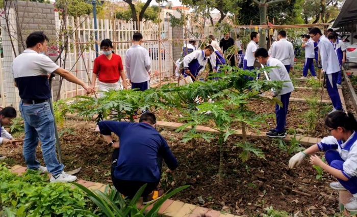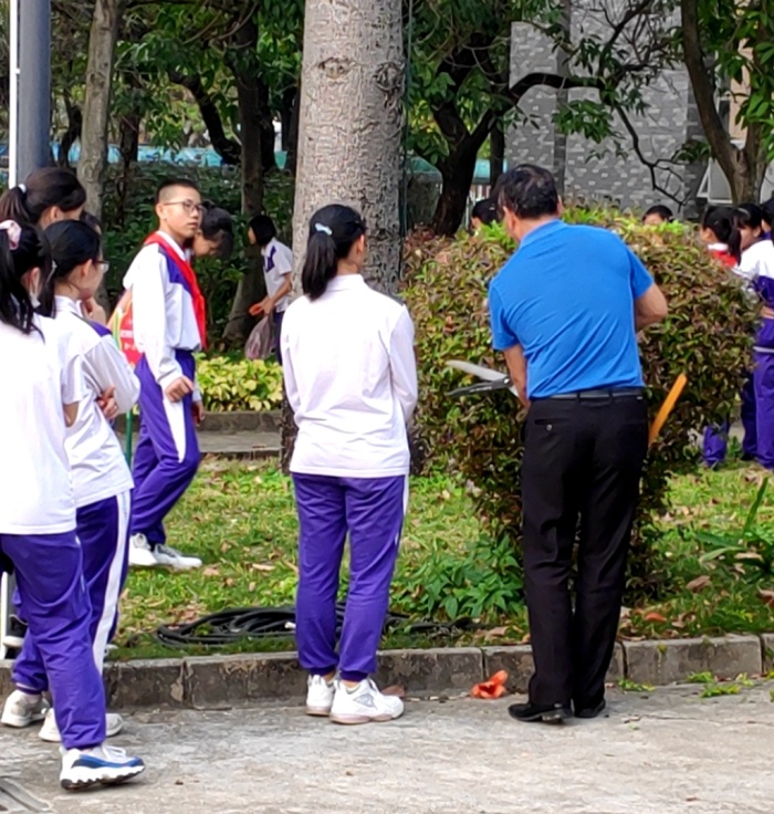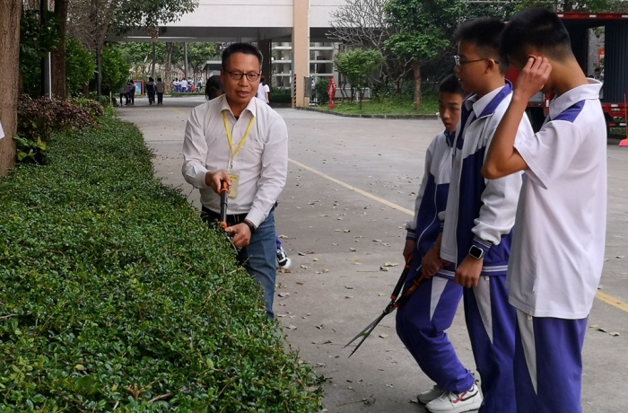 在校園的園藝基地,鐘敏老師、黃小平主任、戴放良主任給參加園藝課程的學(xué)生做示范,如何用園藝專用剪刀修剪校園花木和綠化帶。鐘敏老師是一名體育老師,也特別精通種植,操作起園藝剪非常有講究而且很熟練,學(xué)生們對園藝課程很喜歡,很感興趣。雖然修剪起來有點難度,很辛苦,滿臉是汗水,但他們很主動,愛體驗,臉上帶著快樂的笑容。