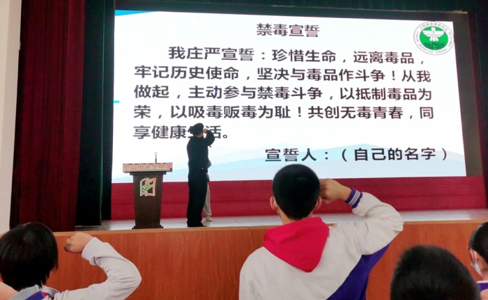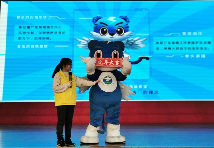 在課堂上,小欖鎮禁毒社工們通過發放禁毒宣傳手冊、展示禁毒仿真模型、知識問答互動等方式,向學生講解毒品的種類、危害,以及如何防范毒品侵害等,特別針對當前出現的經過偽裝的新型毒品作了詳細講解,并指導學生如何快速識別偽裝的毒品,增強防范意識。同時,結合案例,深入淺出地講解禁毒相關的法律法規。期間,特別邀請了廣東禁毒形象大使——“粵虎”現場,讓學生們認識,希望師生們在“虎年”即將來臨之際,“虎”年大吉,拒絕“毒”誘。活動現場氣氛熱烈,每位學生積極主動參與互動,積極回答禁毒知識問答,專心投入到禁毒課堂當中,收獲滿滿的毒品預防教育知識。最后,由禁毒民警帶領全體師生進行禁毒宣誓,誓言鏗鏘有力量,也是永中師生們禁毒防毒的莊嚴承諾!