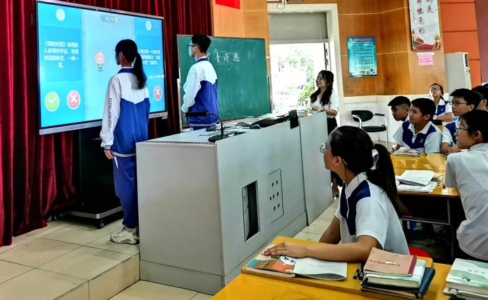 首先,由蔡栩月老師進行分層課堂教學。蔡老師將學生分成了6個小組,利用了希沃白板的多種技術,如游戲化教學、蒙層等方式提升學生課堂注意力與參與度;教學環節突出運用了小組合作和分層教學的方式,通過能力分層、教學內容分層、教學對象分層,層層深入突破教學重難點。