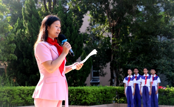 接著,少先隊員代表龍欣橦同學進行主題發言。龍欣橦同學是學校少先隊大隊長、紅色基因宣講員和中山市第八次代表大會正式代表,她向全體少先隊員發起號召:牢記和踐行習近平總書記對少先隊工作的重要指示和要求,學習“四史”,熱愛黨、熱愛祖國、熱愛人民,熱愛社會主義,樹立共產主義遠大理想和中國特色社會主義共同理想,堅定理想信念。作為一名少先隊員,要愛學習、愛勞動、愛鍛煉,要誠實守信、尊老愛幼、友善待人、樂于助人,要厲行節約、反對浪費,積極向上,做到德智體美勞全面發展。