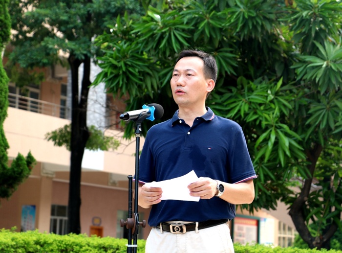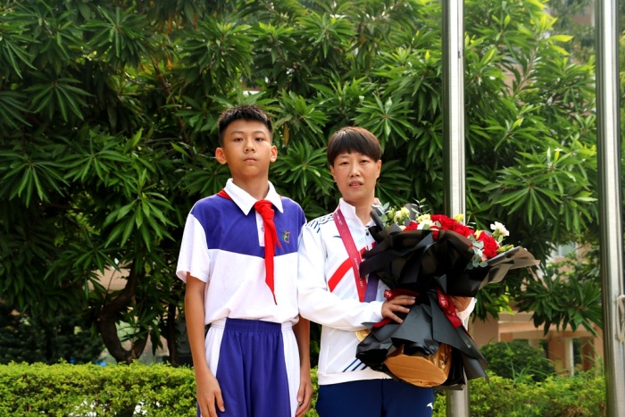 歡迎冠軍回家,在隆重的升旗儀式中拉開序幕。首先,由傅彬同學代表永中全體師生為孫麗艷老師獻上鮮花,祝賀她載譽歸來!全場沸騰,響起了經久熱烈的掌聲。冠軍是榮耀,冠軍是令人羨慕!這是廣東省人民的驕傲、中山市人民的驕傲、小欖鎮人民的驕傲,更是永中師生的驕傲!