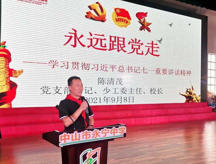 第三議程,由永寧中學少工委主任陳清茂校長作少先隊開學第一課《永遠跟黨走》。陳校長從興國、富國、強國三個時期講述了中國共產黨在實現中華民族偉大復興進程中取得的偉大成就;總結了實現中華民族偉大復興必須堅持的成功經驗,解讀中國共產黨的成功密碼;他激勵少先隊員們在新時代,要牢記殷切希望,勇擔歷史使命,立志做一個有理想、有志向、有追求、有責任感、有奉獻精神的接班人。