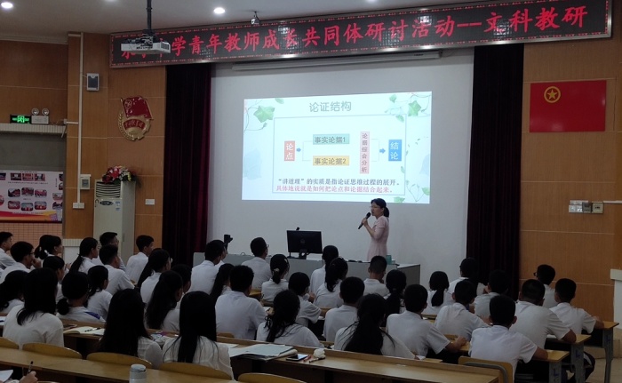 活動第一項:聽課。與會老師觀摩由語文科組丘彥老師帶來的優質研討課:《議論文專題----論證結構》。首先,丘老師根據學生自評和老師估測對學生進行了青銅組、白銀組和黃金組的分層,明確了初級、中級和高級三層教學目標,并檢查了課前布置的分層預習作業。然后,丘老師緊扣議論文結構的基本主線,即論點--事實論據--結論,采用了分層的文本、分層的活動和分層的訓練,由基本結構到較復雜的變式,逐層遞進,攻破難點,將分層教學具體落實到各個教學環節之中。最后,丘老師對學生進行了堂上分層檢測,并對學生進行了分層評價,整節課丘彥老師思維縝密,和藹親切,與學生輕松互動,課堂氣氛非?;钴S,學生檢測反饋效果較好。