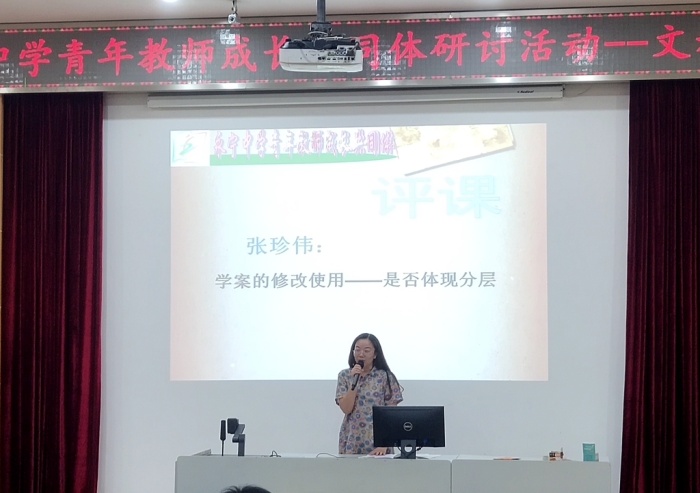 活動第二項:評課。首先,丘老師就本節課的分層教學進行了說課,詳細地從分層教學設計和分層教學實施兩大方面向大家做了詳細闡述,讓老師們對這堂課以及分層教學有了更清晰的認識。接著,語文、英語、政史地科組老師代表進行評課。語文科組張珍偉老師著重從學案分層設計的角度來闡述。英語科組侯淑芳老師則從課堂分層落實情況發表了自己的見解。她重點回答了兩方面的問題:1.如何調動學生的積極性?對不同的學生分別采取了哪些策略、方法?效果如何?2.教學過程中如何體現分層?不同層次的學生掌握得如何?政史地科組張婧姝老師則重點從以下角度進行評課:1.學生參與度如何?2.課堂效果、學生掌握程度如何?3.本節課教學目標達成情況,學生的反饋情況如何?三位老師從不同的評課視角詳細闡述了本節課分層教學的方方面面,有想法,有見地,與會的老師聚精會神,受益匪淺。