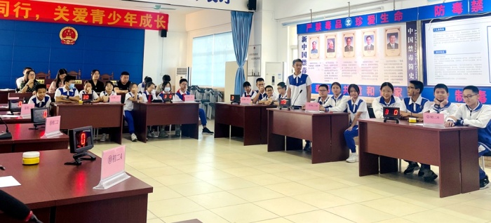 本次選拔賽由鐘梅嬌老師、官怡婷老師主持,戴放良主任、謝芷芊老師、文仁歡老師擔任評委,參照市區賽的模式,采取現場知識擂臺賽的方式,通過必答題、搶答題、風險題、加賽題四個環節決出勝負。競賽內容涵蓋了《中華人民共和國憲法》、民法典、基本法律法規及與青少年學生健康成長密切相關的法律法規。比賽現場,憑著充分的知識儲備,選手們立刻進入了激烈比拼的狀態。場上群情激昂又步步驚心,二號臺的初二(6)班代表隊表現出眾,一度遙遙領先,一下調動了現場氣氛。六號臺的二(7)班代表隊、七號臺的二(5)班代表隊也紛紛發力,把比分拉近,現場氣氛熱烈,不斷響起掌聲。