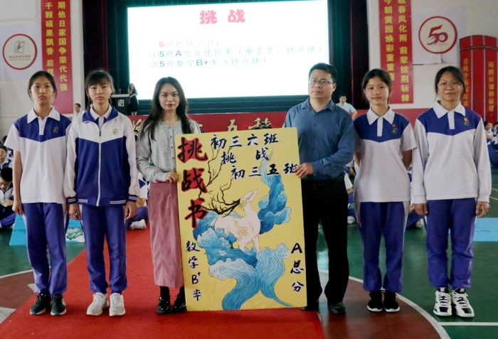 第二篇章,少年強(qiáng)。各班分別向其他班發(fā)起挑戰(zhàn),宣讀挑戰(zhàn)書,臺(tái)上臺(tái)下都充滿不服輸?shù)臒崃腋?jìng)爭(zhēng)氣氛,氣勢(shì)十足。班級(jí)代表們霸氣十足的發(fā)言,彰顯了同學(xué)們沖刺中考的信心和勇氣,現(xiàn)場(chǎng)掌聲和喝彩聲不斷。