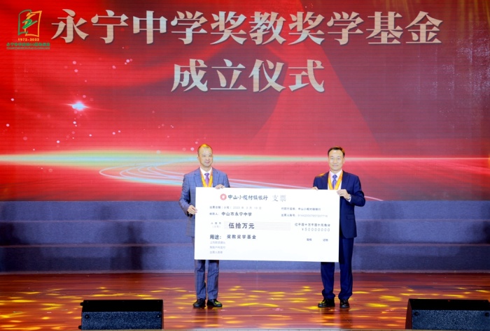 永寧中學五十年的發展,離不開辛勤付出的歷任領導與老師,離不開社會各界的支持和幫助。慶典上舉行了“功勛教師”、“50周年校慶捐贈答謝”的頒獎儀式以及“永寧中學首屆校友會授牌典禮”,姜術俊、趙錫雄、全國等市鎮領導向功勛教師以及為校慶捐贈作出杰出貢獻的個人和單位贈送紀念品,為校友會成員頒發聘書,向為永中發展作出巨大貢獻的教師、優秀校友、社區鄉賢、熱心企業等表達最誠摯的謝意。永寧中學首屆校友會會長李添馳在致辭中,代表校友會籌備組表達了真誠的感謝,號召校友們積極參加校友會活動,支持校友會工作,融入永中大家庭,建言獻策,團結互助,攜手共創母校美好的明天。隨后,李添馳會長代表校友會把獎教獎學基金的50萬啟動資金支票贈給了母校,宣告永寧中學獎教教學基金正式成立了。