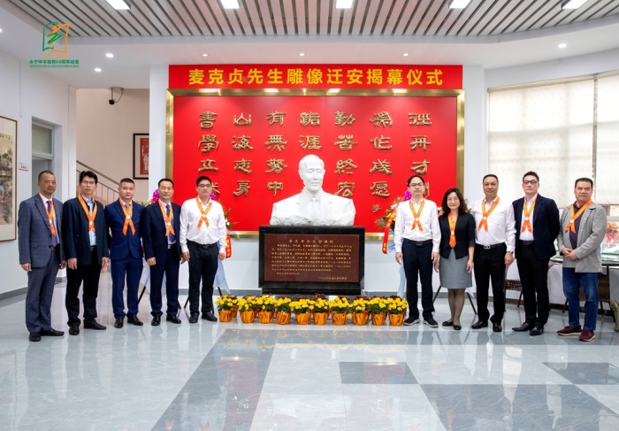 麥克貞先生像遷安揭幕儀式。飲水思源,永中能有今日的輝煌,首先要感謝的是永寧中學的榮譽校長麥克貞先生。麥先生熱心家鄉建設,投資興辦廠企,重視教育公益福利事業,為家鄉建設和公益事業作出了重大貢獻。永寧中學麥克貞先生雕像始建于1992年,在永寧飛駝嶺旁的舊校舍,在2007年遷安至永寧中學現校址的舊校史室前。2022年,由于升級擴建校史館,今為麥克貞先生像第三次遷安。領導、嘉賓們為麥克貞先生雕像揭幕,學生們為麥克貞先生獻花,表達敬意。