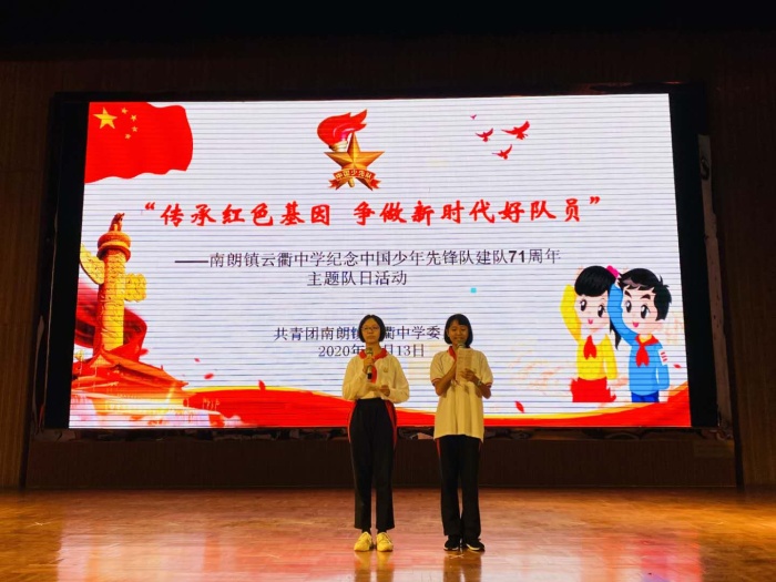 2020年10月13日下午,云衢中學在該校藝體中心順利舉行了“傳承紅色基因 爭做新時代好隊員”-慶祝中國少年先鋒隊建隊71周年主題隊日活動,云衢中學副校長曾建清、副校長劉毛古、主管初一年級的朱榅梅及周寶思主任、團委書記范斌斌、團委副書記及少先隊大隊輔導員楊勇等行政,云衢中學中隊輔導員和初一部分少先隊員參加了本次活動,此次活動由初一(8)班林楚琪和初一(13)班尹穎睿主持。