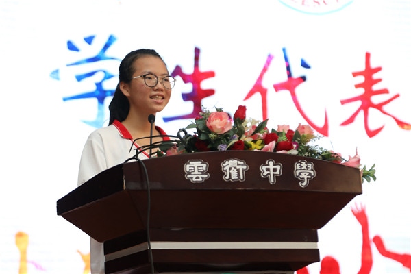 初三(3)班的楊家渝同學作為學生代表發言。她深情回顧了三年來在云衢中學度過的美好時光,表達了對母校的不舍與感恩之情。“樹高千尺也忘不了根,雖然我們離開了,但我們還會回來,午夜夢回,云衢必定常在我心。因為那是水滴對源頭的思念,那是綠葉對根的情誼!”楊家渝同學的深情告白引起了在場每一位云衢學子的共鳴。