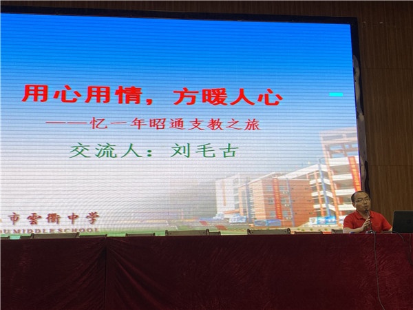 在分享會(huì)上,劉毛古老師回顧了其在云南昭通大關(guān)縣一年的點(diǎn)滴支教經(jīng)歷。他首先介紹了支教地點(diǎn)的艱苦生活環(huán)境以及學(xué)生的學(xué)習(xí)環(huán)境,讓人切實(shí)感受到當(dāng)?shù)厣畹钠D辛以及開展教學(xué)的不容易。接著劉老師向老師們分享在云南支教開展的各項(xiàng)工作,如:面對(duì)“學(xué)困生”學(xué)習(xí)質(zhì)量低下的壓力,他思對(duì)策、想辦法,努力提升所教班級(jí)的教學(xué)質(zhì)量。此外,參加學(xué)校管理,帶去云衢理念;參與語文教學(xué),助力提升當(dāng)?shù)亟虒W(xué)質(zhì)量;參與開展各類課堂教學(xué)調(diào)研,推廣課改理念;開設(shè)講座、專題培訓(xùn)等,參與當(dāng)?shù)亟萄谢顒?dòng)。他在分享會(huì)中談到,在各方力量的堅(jiān)持和用心努力下,使當(dāng)?shù)亟虒W(xué)質(zhì)量有所提高,這其中也有云衢中學(xué)和中山各方力量的關(guān)心、支持和幫助,使得名城中山愛傳千里,云南人民生活有明顯提高。最后,劉老師向老師們分享了支教中所得的七點(diǎn)感悟啟迪:對(duì)他人要有體諒之心;對(duì)工作要有進(jìn)取之心;對(duì)學(xué)生要有關(guān)愛之心;對(duì)單位要有善待之心;對(duì)困境要有思變之心;對(duì)生活要有感恩之心;對(duì)名利要有恬淡之心。短暫的幾十分鐘,劉老師的分享會(huì)深深感染了在座的老師們。