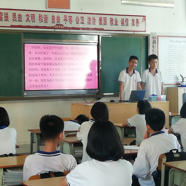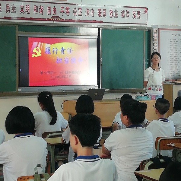 各位班主任用心備課,精心組織,活動有聲有色,效果明顯。有的班主任結合7月1日建黨節,講述了共產黨在民族危難之際挺身而出力挽狂瀾的豐功偉績,引導學生愛國愛黨,擔當使命;有的班主任結合德育處提供的《戰役一線黨旗紅》視頻資源,引導學生理解共產黨人的使命擔當;有的班主任挖掘全國抗擊疫情涌現出的無私奉獻、勇于擔當的英雄故事,引導學生明白責任擔當的內涵與意義;有的班主任結合學生的生活,引用學生身邊的典型例子,引導學生向身邊的榜樣學習,做到志存高遠,刻苦學習,要為班級承擔責任,貢獻力量,要承擔家務,孝順父母。班主任們通過感人的案例,精巧的設問,生動的語言,引導學生主動思考積極體驗。有的班主任安排學生主持班會,給學生提供自我教育自我鍛煉的平臺。
