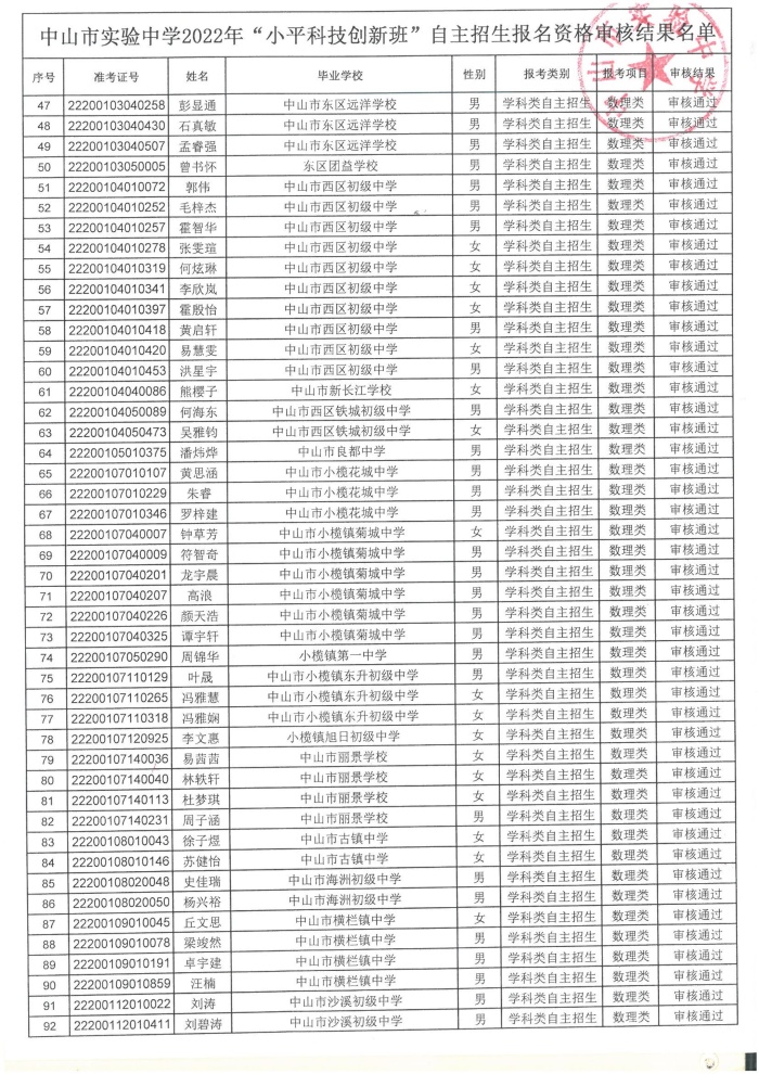 附件:中山市實驗中學2022年“小平科技創新班”自主招生考核資格審核結果名單
