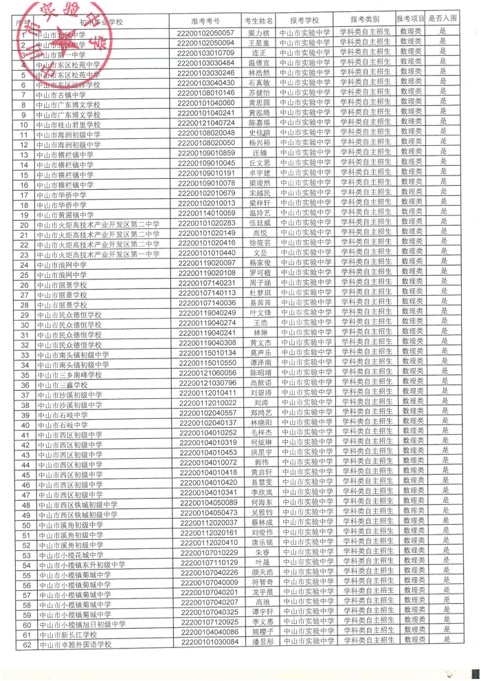 附件:中山市實驗中學2022年“小平科技創新班”學科類自主招生學校考核入圍名單