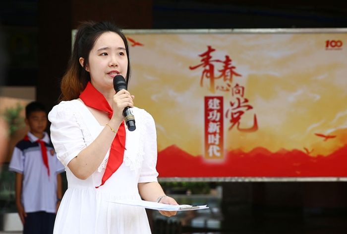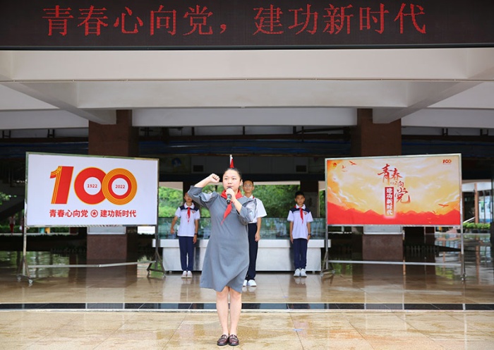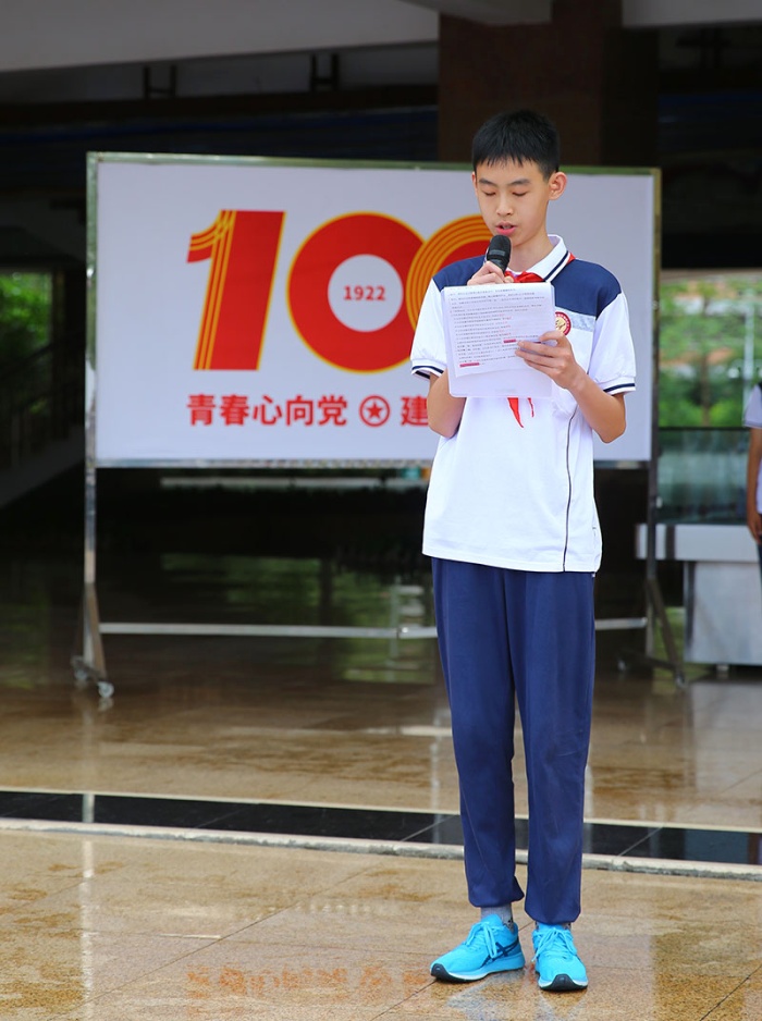 中學部團委副書記李凌霄希望今天離隊的同學們謹記少年先鋒隊入隊誓詞,做有志青年,做進取青年,做奮斗青年,通過自己的努力,早日加入中國共產主義青年團,向著更遠大的目標前進。