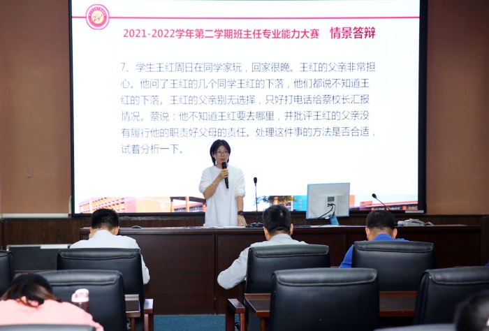 “情景答辯”環節,參賽選手通過抽簽選擇不同案例,并結合實際進行分析,提出解決問題的思路、對策和依據。案例涉及廣泛,包括著名教育家蘇霍姆林斯基提出的“只有教師關心人的尊嚴,才能通過學校學習來教育學生。教育的核心本質上是讓孩子們始終體驗他們的尊嚴感。”要求參賽選手結合實際工作談理解;還包括在班級管理中常常遇到的學生之間發生沖突、輟學、厭學好動、攀比、違紀違規等情況發生時,班主任該如何處理等,要求班主任在答辯中有效運用教育學、心理學原理,科學分析,準確判斷,提出得當的、操作性強的對策。
