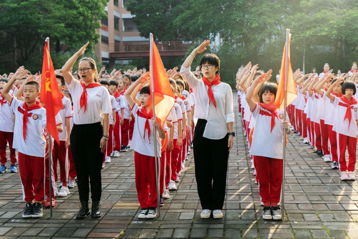 戴上紅領巾,就多了一份責任。新隊員高舉右拳,面向隊旗,莊嚴宣誓:“我熱愛中國共產黨,熱愛祖國,熱愛人民,好好學習,好好鍛煉,準備著,為共產主義事業貢獻力量。”鏗鏘有力的宣誓聲充分展現了作為社會主義事業接班人的信念和決心。