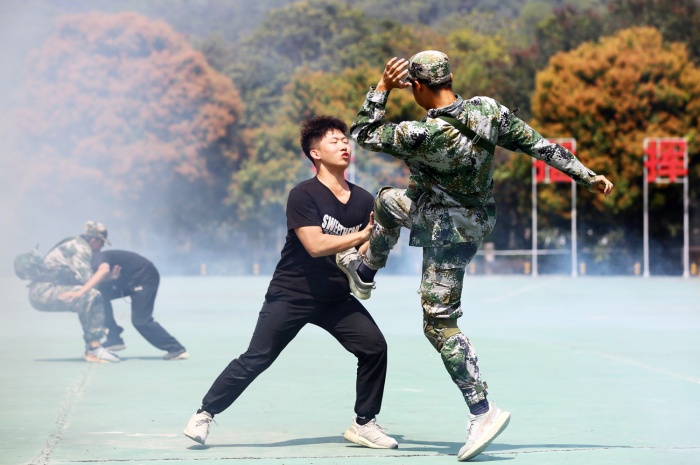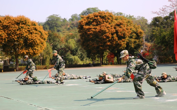 此次軍訓(xùn)成果展示共有5個方陣接受檢閱,分別是隊列方陣、拳術(shù)方陣、匕首操方陣、戰(zhàn)術(shù)演練方陣和手語操方陣。隊列方陣表演中,同學(xué)們熟練掌握了稍息立正、停止間轉(zhuǎn)法、敬禮禮畢等隊列訓(xùn)練科目;匕首操方陣氣勢浩大,一百余名英勇威武的“戰(zhàn)士”手持戰(zhàn)斗匕首,口號鏗鏘動作剛勁;軍體拳方陣動作精練實用、舒展大方,戰(zhàn)術(shù)演練方陣迅速標(biāo)準(zhǔn)的完成了翻滾前進、臥倒在地、匍匐前進等一系列軍事技能動作,一招一式干凈利落……精彩的表演充分展示了同學(xué)們這幾天來的“從軍”成果和精神風(fēng)貌。