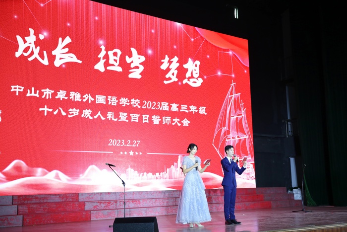 “以我火紅青春,描繪人生華章,竭盡全力夢(mèng)為馬,問(wèn)心無(wú)愧鑄輝煌,奮戰(zhàn)百天,高考大捷。”2月27日,卓雅外校隆重舉行2023屆高三年級(jí)18歲成人禮暨高考百日誓師大會(huì),全體師生共同宣誓,在橫幅上簽名立志,老師和父母為學(xué)子佩戴成人徽章,一同見證學(xué)子走過(guò)成人門,正式邁向成年人的世界,向百日后的高考發(fā)起沖刺。