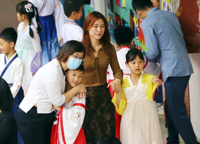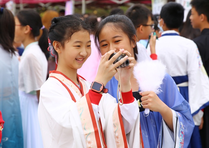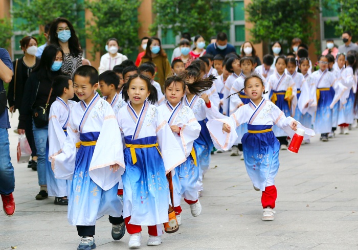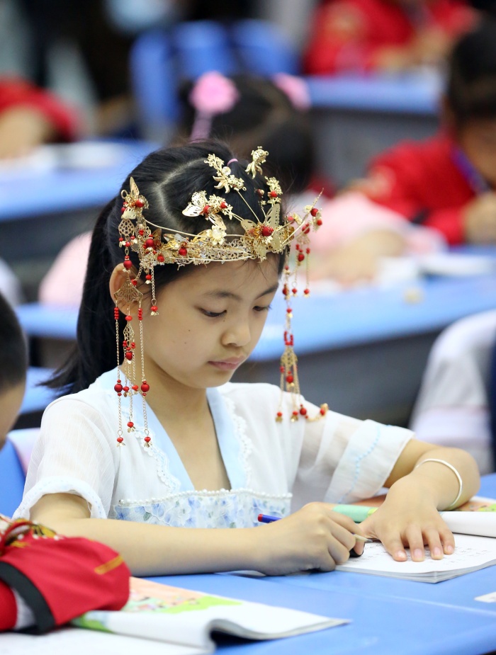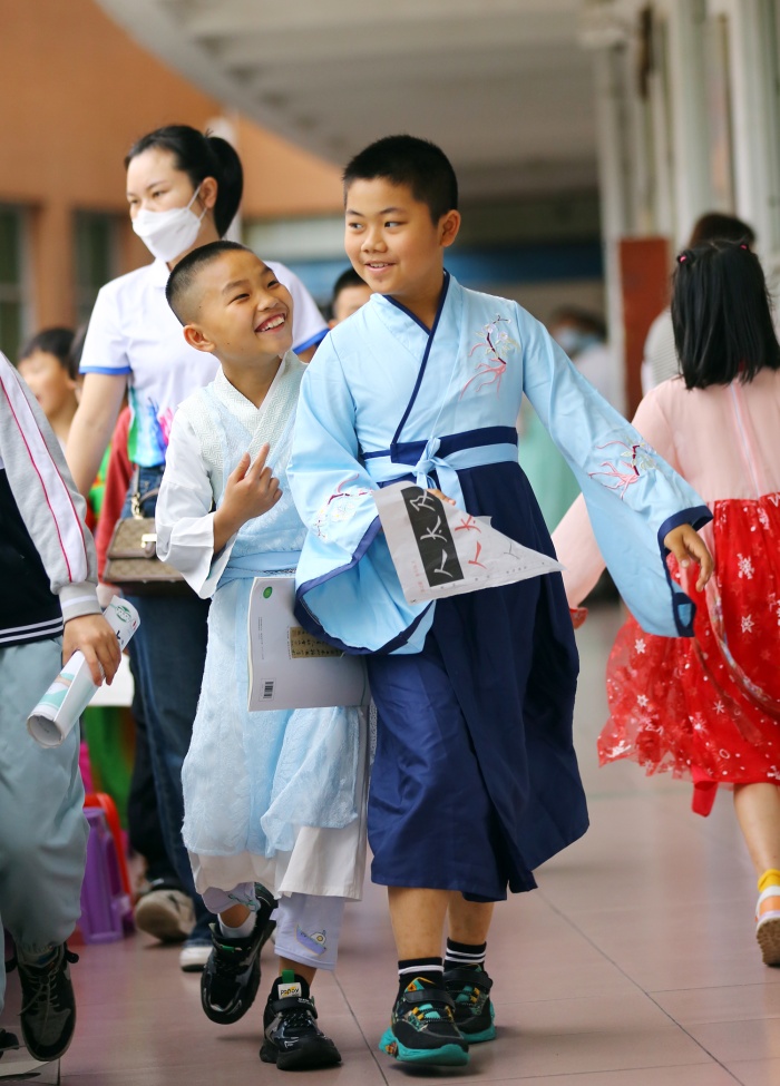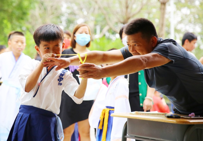 在第二屆傳統(tǒng)文化暨讀書節(jié)展示活動中,一二三年級的同學們表演了課本劇《荷葉圓圓》,一同齊誦《弟子規(guī)》、漢樂府詩歌《江南》,在優(yōu)美的古詩詞中感受閱讀的樂趣。展示活動后,同學們與爸爸媽媽一起參與到游園活動中,“甲骨文里尋始祖”“腦筋運轉謎底見”“你演我猜合作樂”“漢字啄木鳥”“正中靶心”等游戲攤位前排滿了摩拳擦掌的小朋友。“各類小游戲基本上都和傳統(tǒng)文化有關聯,踢毽子、射箭、打陀螺、踩高蹺等等,孩子們穿著漂亮的傳統(tǒng)服飾跑來跑去熱情參與,我感受到了他們的快樂。”一年級林子陽的爸爸說,卓雅“活動育人”的理念在開放日活動中有了很好的體現,同學們在收獲快樂的同時也學到了知識。