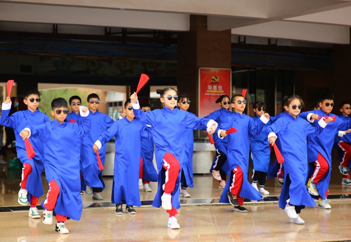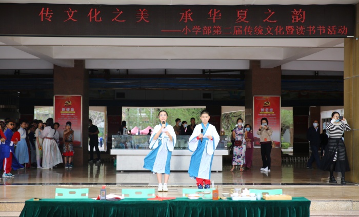 大課間,家長們來到操場,觀看“課外閱讀校本課程成果展示”,同學們身著漢服盛裝出席,手持折扇風度翩翩,以情景劇、歌舞表演、手語操、詩歌朗誦等形式,再現西游記、千字文、魯濱遜漂流記等中外名著名篇的精彩內容,小學部還邀請家長身著傳統(tǒng)服飾參與到茶藝表演中,與同學們一起感受優(yōu)秀的中國傳統(tǒng)文化。
